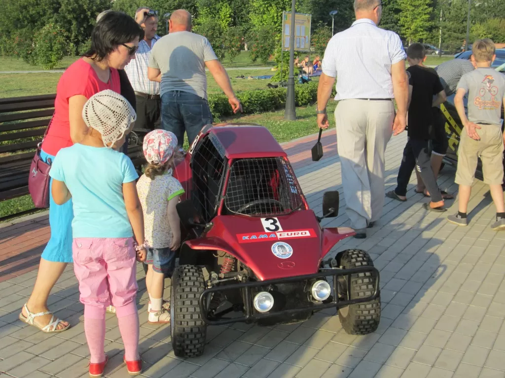 Малыши интересовались крошечным багги, даже пытались прокатиться и поиграть с ним, как с электро-машинками, на которых можно проехаться здесь же в парке. Но, несмотря на свою «мультяшную» внешность, этот автомобиль – настоящий ветеран битв на кроссовых трассах, прошедший не одну гонку. Более уважительное отношение проявляли к автомобилю Honda, раскрашенной в цвета Vaitti, которой также знаком вкус победы и горечь поражений. Горожане подходили, интересовались, фотографировались.