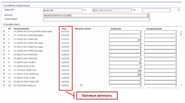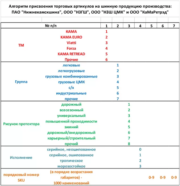 По результатам предложений контрагентов с 13 июля 2016 года ООО «Торговый дом «Кама» внедрило торговые артикулы на реализуемую шинную продукцию. Практика использования товарных кодов на готовую продукцию очень популярна, в том числе среди шинных производителей. Порядок присвоения кода и символическое обозначение у компаний существенно разнятся. Производители используют как цифровые обозначения, так и буквенные.