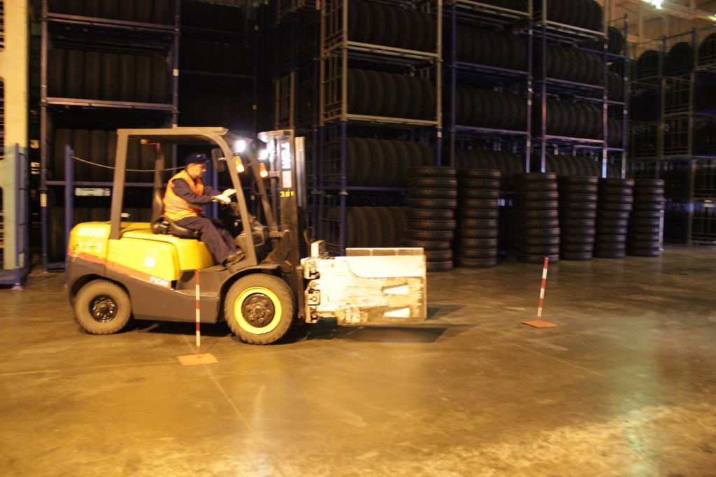 • а также проверка качества и скорости перевозки шин. Так, водителям погрузчика в третьем этапе требовалось перевезти точное количество шин (по 7 из 10 в колонне) на специальный поддон, а в четвертом - аккуратно, соблюдая технику безопасности, перевезти загруженный шинами поддон, состоящий из четырех ярусов, в указанную ячейку. При выполнении этого задания важны ловкость, мастерство и опыт водителя, ведь попасть на четыре опоры на высоте 4-5 метров - задача не из простых. Каждое нарушение или неправильный ответ карались штрафными секундами. К слову, в итоговом зачете эти секунды очень повлияли на распределение мест, всего одна секунда сыграла важную роль!