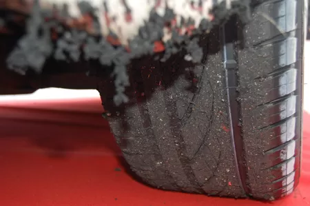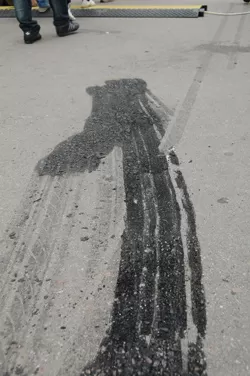 Изумленная публика долго не расходилась, разглядывая следы «творения» на асфальте и сравнивая с рисунком протектора, представленного на стенде.